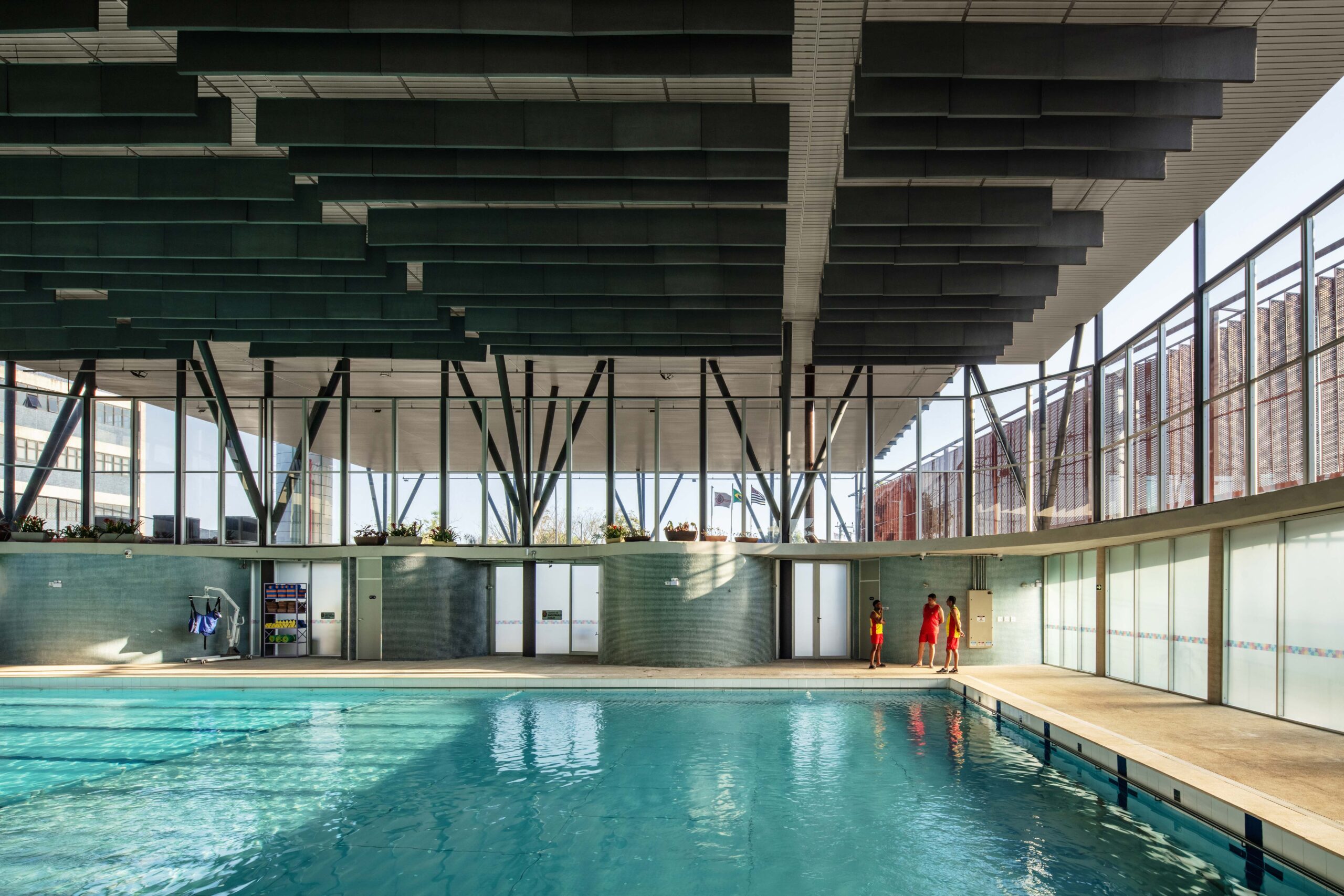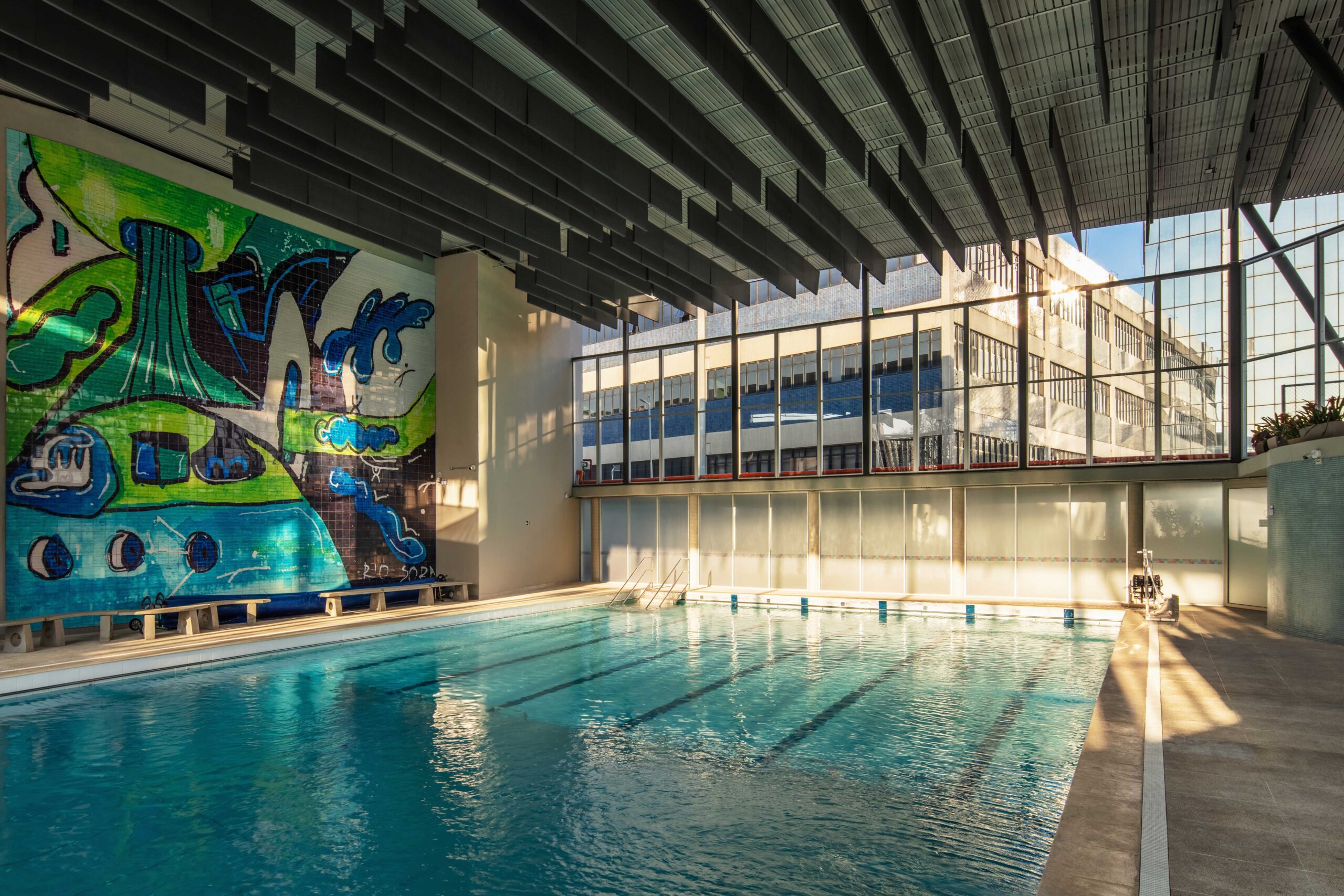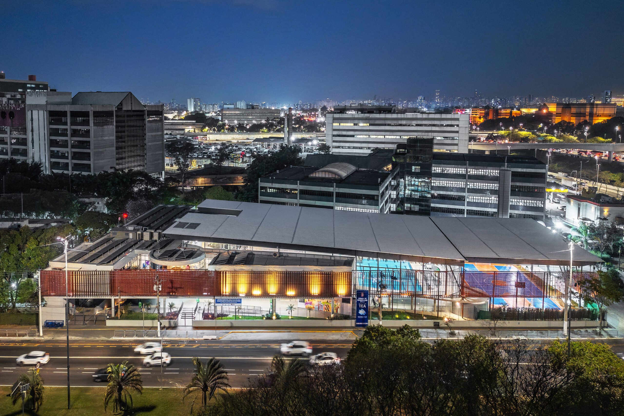 Um teatro para 250 lugares e a área esportiva (piscina e quadra poliesportiva) complementam o Centro TEA, ampliando e enriquecendo sua atuação como equipamento público.